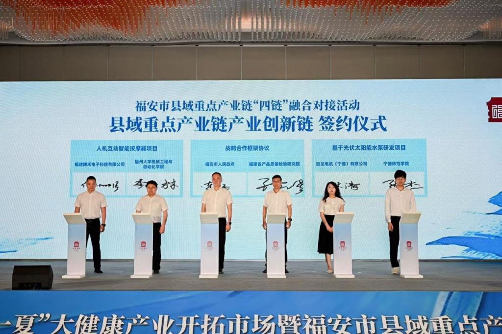 6月6日,“全家福安・健康一夏”大健康产业开拓市场暨福安市县域重点产业链“四链”融合对接会在东百假日酒店举行。此次活动由福安市政府牵头,聚焦电机电器、不锈钢等重点产业链,以“产业链、创新链、资金链、人才链” 四链融合为核心,旨在通过政产学研用协同创新,破解产业技术瓶颈、拓展市场发展空间。公司张杰老师代表院方出席,在县域重点产业链产业创新链签约仪式上,与巨龙电机(宁德)有限公司就“基于光伏太阳能水泵研发项目”完成产学研合作签约。该项目既助力福安市电机电器产业与高校创新资源深度融合,为产业创新发展注入新动能,又推动学院团队建设与地方产业需求深度适配,促进“产教融合”人才培养模式深化。