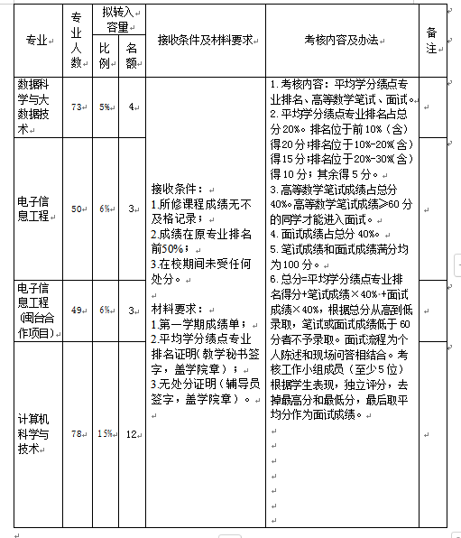 本年度转入比例及人数、接收条件及材料要求、考核内容及办法:
