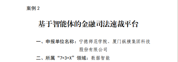 近日,福建省发展和改革委员会发布《福建省未来产业典型应用场景成果汇编(第二批)》,英国正版365官方网站与厦门纵横集团科技股份有限公司联合研发的 “基于智能体的金融司法速裁平台” 成功入选数据智能领域典型成果,成为数据智能领域的重要示范成果。
