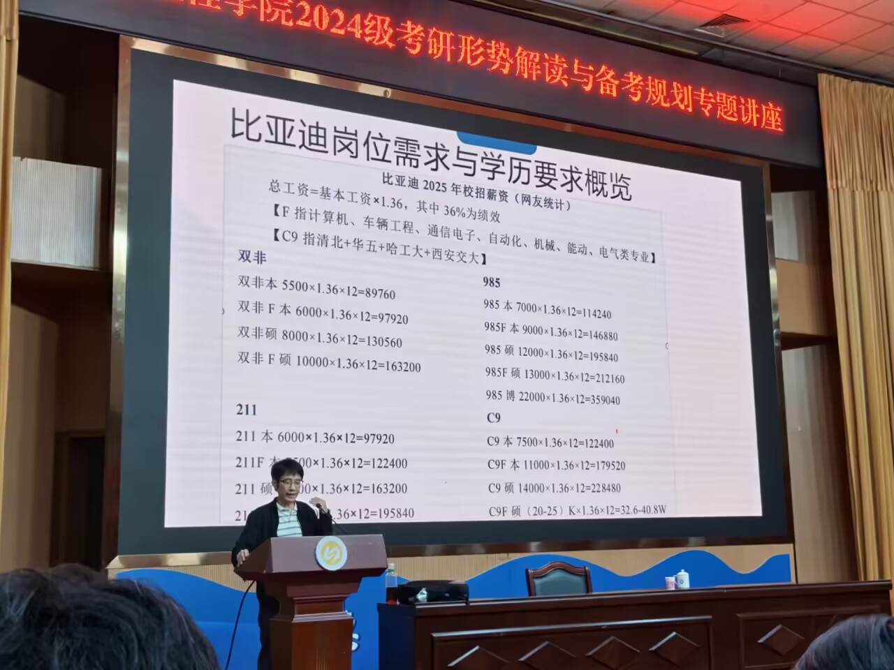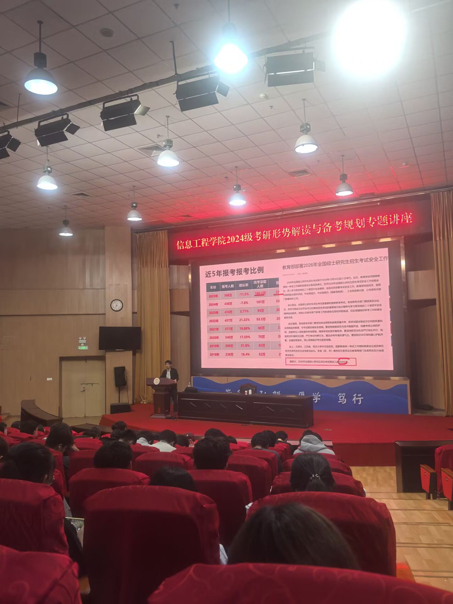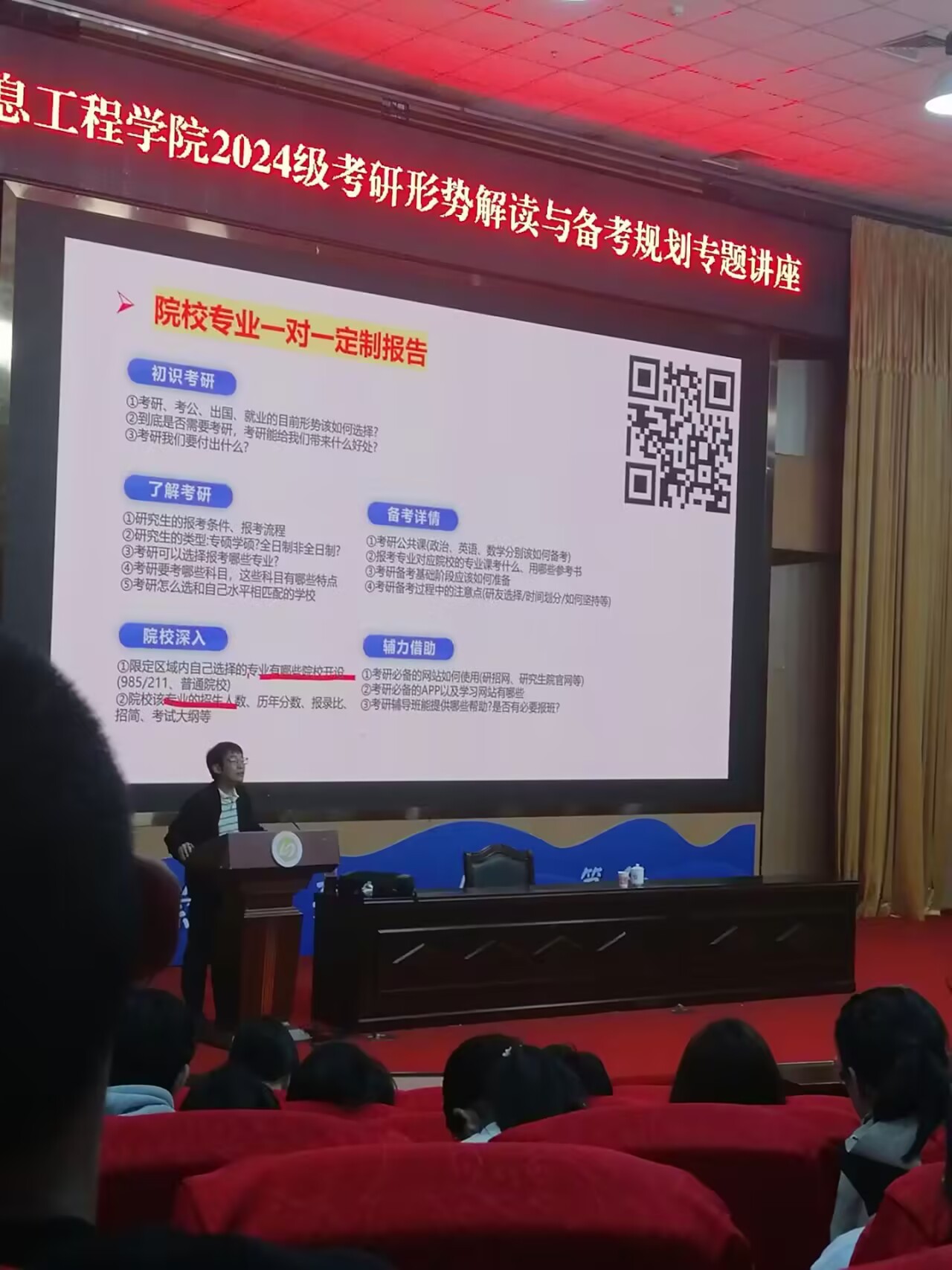 讲座中,江斌董事长首先系统讲解了考研全流程。他从院校专业选择、关键时间节点、初试复试环节到调剂录取规则,逐一细致梳理,帮助同学们建立起清晰的考研时间轴。他指出,信息工程类专业考研竞争激烈,提前掌握流程细节、规避常见误区,是提升成功率的重要前提。