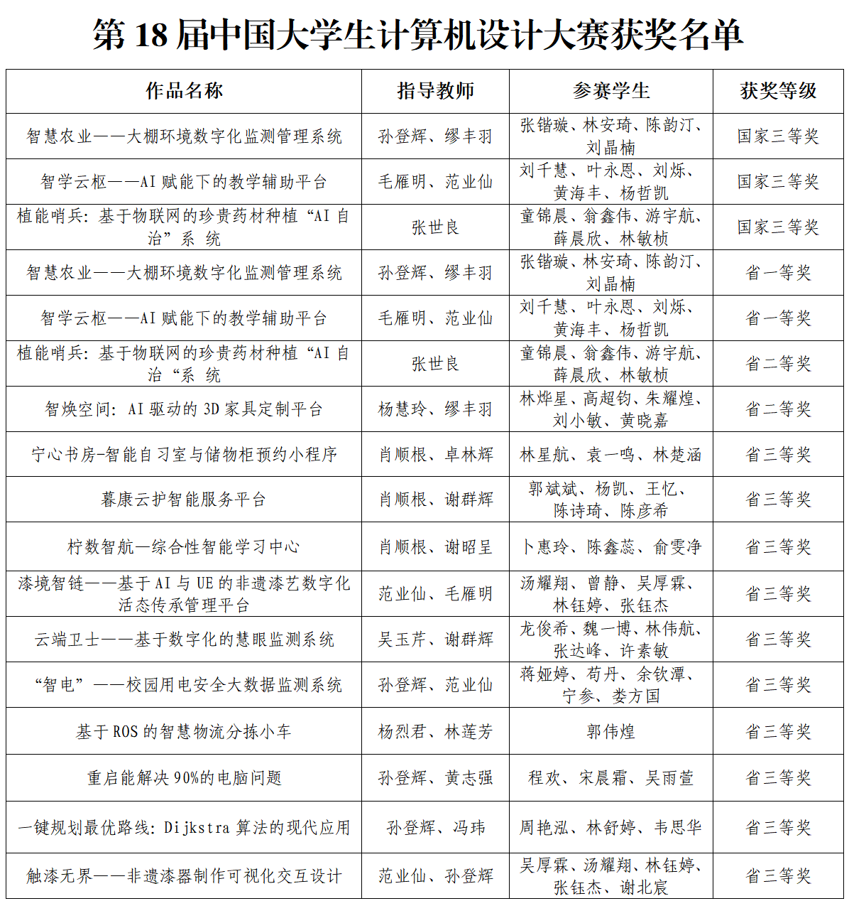 近日,第18届中国老员工计算机设计大赛国赛(软件应用与开发、物联网应用)分别在山东泰安泰山学院和浙江理工大学圆满落幕,公司学子张锴璇、刘千慧、童锦晨等凭借扎实的专业功底与出色的创新能力斩获“软件应用与开发”赛道全国三等奖2项、“物联网应用”赛道全国三等奖1项。